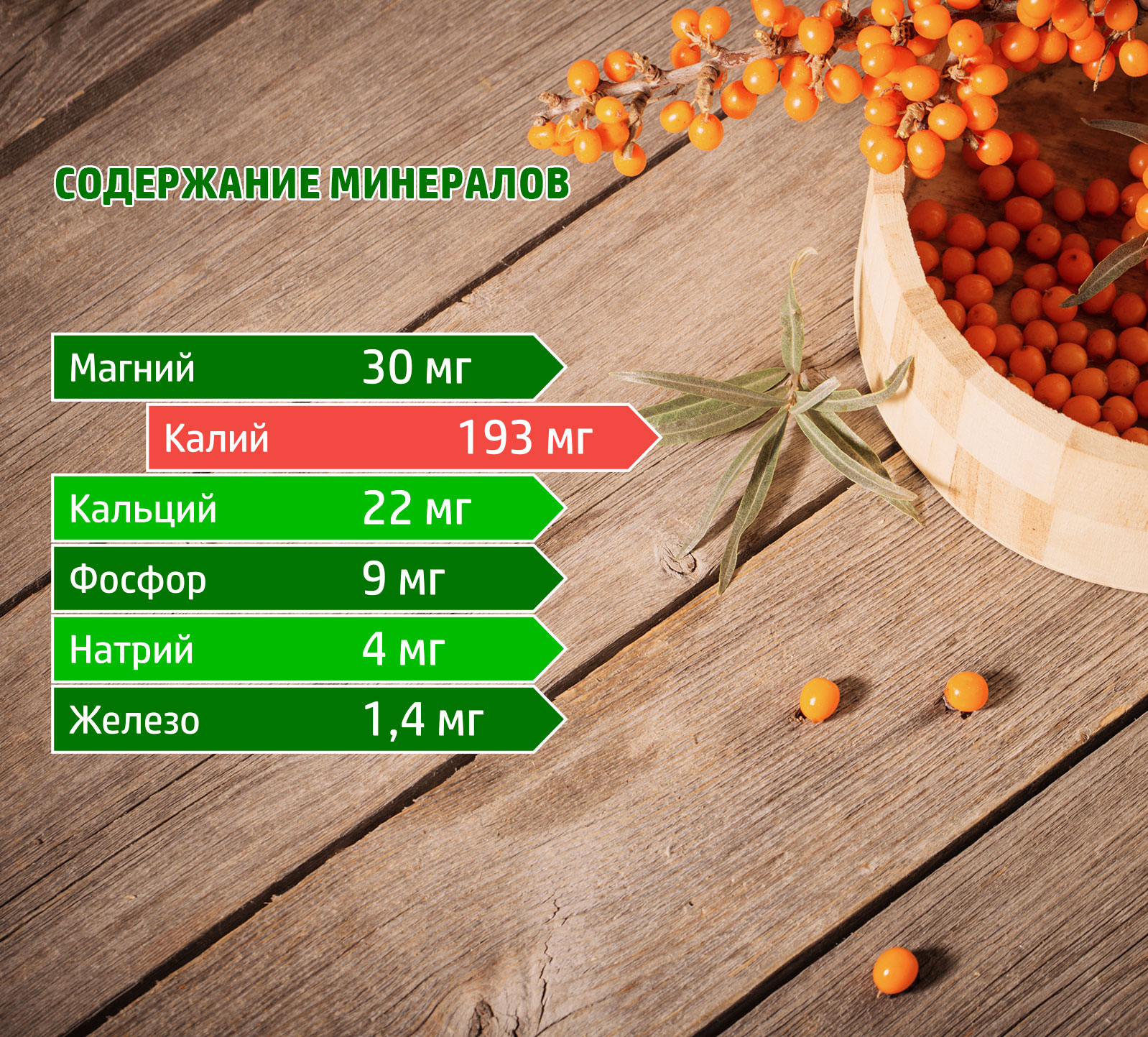 Освежающий привкус ягоде придают различные кислоты, которые стимулируют пищеварение. Облепиху еще называют витаминной бомбой, так как в ней много витаминов, особенно С, самого активного борца с вирусами, который в оранжевой ягоде сохраняется даже после заморозки и термической обработки. Пара ложек облепихового масла удовлетворяет суточную потребность организма в витамине Е. Кстати, продуктов с такой концентрацией витаминов С и Е, как у облепихи, немного. В ее составе к тому же есть каротиноиды, в том числе провитамин А.