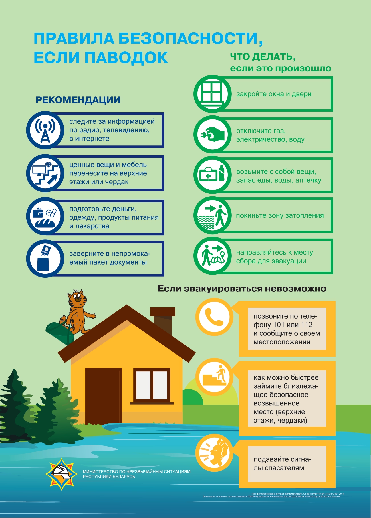 В любой чрезвычайной ситуации очень важно сохранять спокойствие и не паниковать. Держите рядом «тревожный чемоданчик» или самые необходимые вещи в целлофановом пакете, по возможности быстрее уходите из зоны затопления. Если такой возможности нет, то поднимитесь как можно выше, на верхние этажи. Если дом одноэтажный, то постарайтесь выбраться на чердак. Сигнализируйте спасателям, чтобы они могли вас заметить.