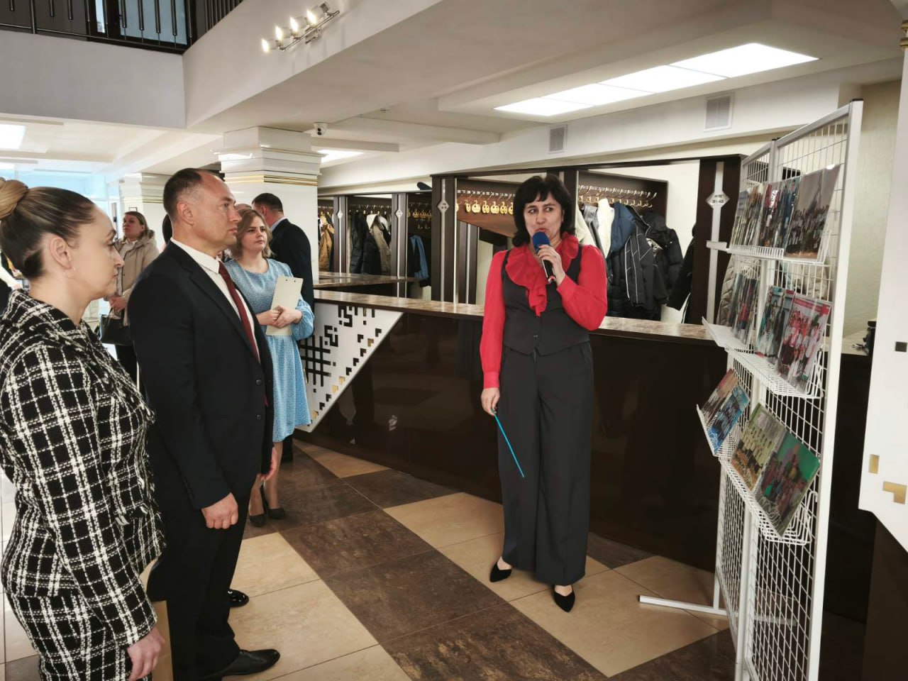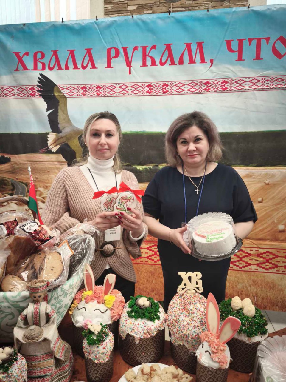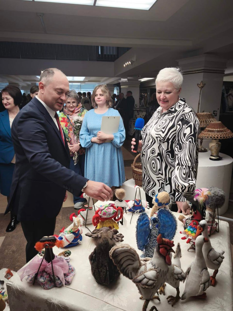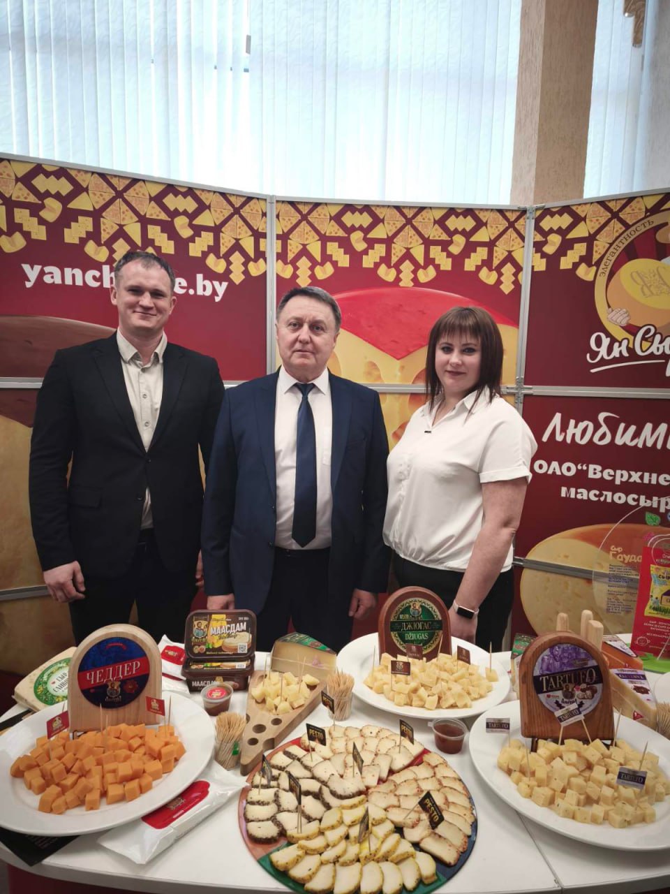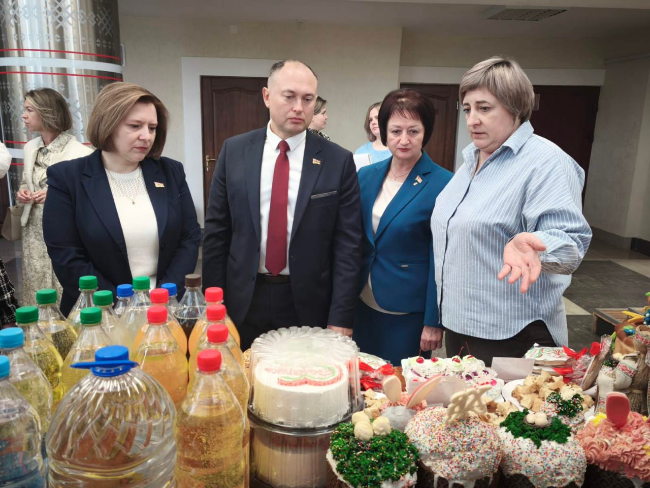 На празднике «Верхнедвинщина трудовая» местные производители знакомят председателя райисполкома Виталия Лавринова, председателя райсовета Ирину Козел и заместителя председателя райисполкома Наталью Демешко с новой продукцией.