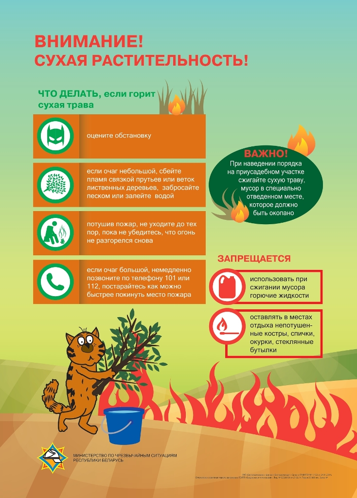 Как правило, пламя от костра быстро перебрасывается на сухую траву, распространяется на большую площадь и остановить его, порой, очень сложно. Чтобы не допустить подобных случаев помните, что сжигание мусора допускается только в безветренную погоду. Место, где планируете сжигать собранный мусор должно находиться на безопасном расстоянии от хозяйственных и иных построек, а также от лесных массивов и торфяников. Место для костра обязательно окопайте, запаситесь ведром с водой, лопатой и ни на секунду не оставляйте огонь без присмотра. После окончания сжигания, оставшиеся угли пролейте водой до полного прекращения тления.